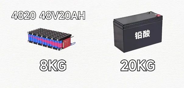 咱们就以惯例电动自行车4820,48伏,20安时的电池为例:固然不到一度电可是若是用铅酸电池来做的话分量差未几到达20千克而锂电池的分量大要是8千克。